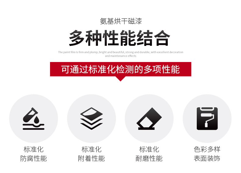 標(biāo)準(zhǔn)化漆膜色澤:氨基烘干漆具有可通過標(biāo)準(zhǔn)化檢測(cè)下的保光保色性、漆膜色澤鮮艷、堅(jiān)硬光亮檢測(cè)試驗(yàn);