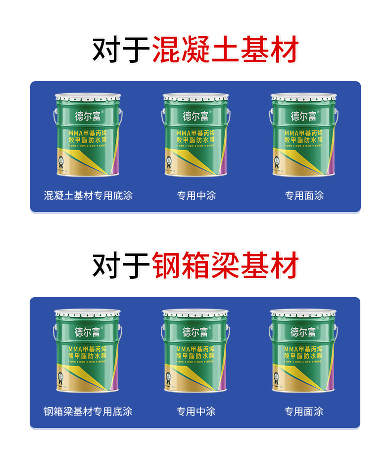 MMA甲基丙烯酸甲酯防水膜是我們專為城際高速鐵路和城市輕軌、高鐵站等混凝土和鋼結(jié)構(gòu)防護而開發(fā)的,是融合了高性能MMA樹脂的噴涂式彈性防水涂層。