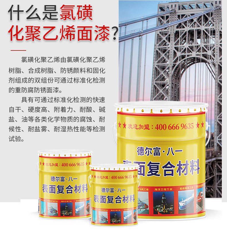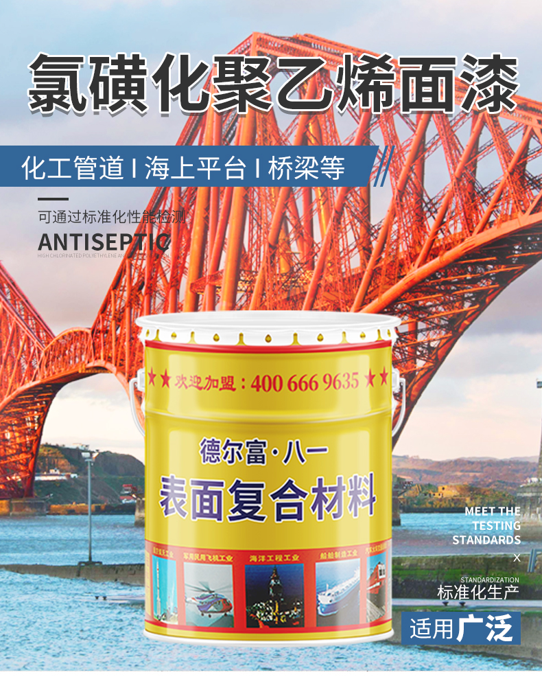 【德爾富】氯磺化聚乙烯面漆由氯磺化聚乙烯橡膠、改性樹脂、顏料、助劑及溶劑等組成。