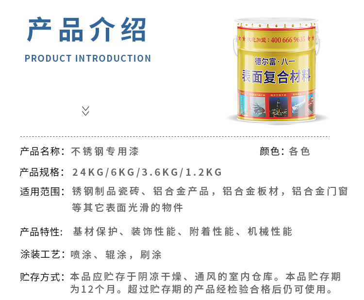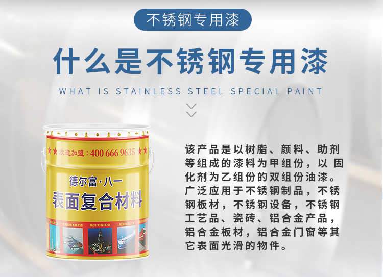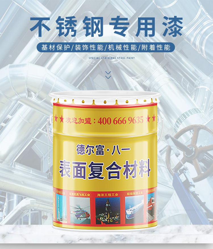 【德爾富】不銹鋼專用漆是我們針對光滑金屬表面不易涂裝上漆而研制的,具有可通過標準化檢測的物理機械性能和防腐性能。不銹鋼、鋁合金、鍍鋅板、鋁板、銅、合金、有色金屬等基材,由于其表面非常光滑,導致涂漆后出現掉漆脫落的問題,使用不銹鋼專用漆可解決這一問題。