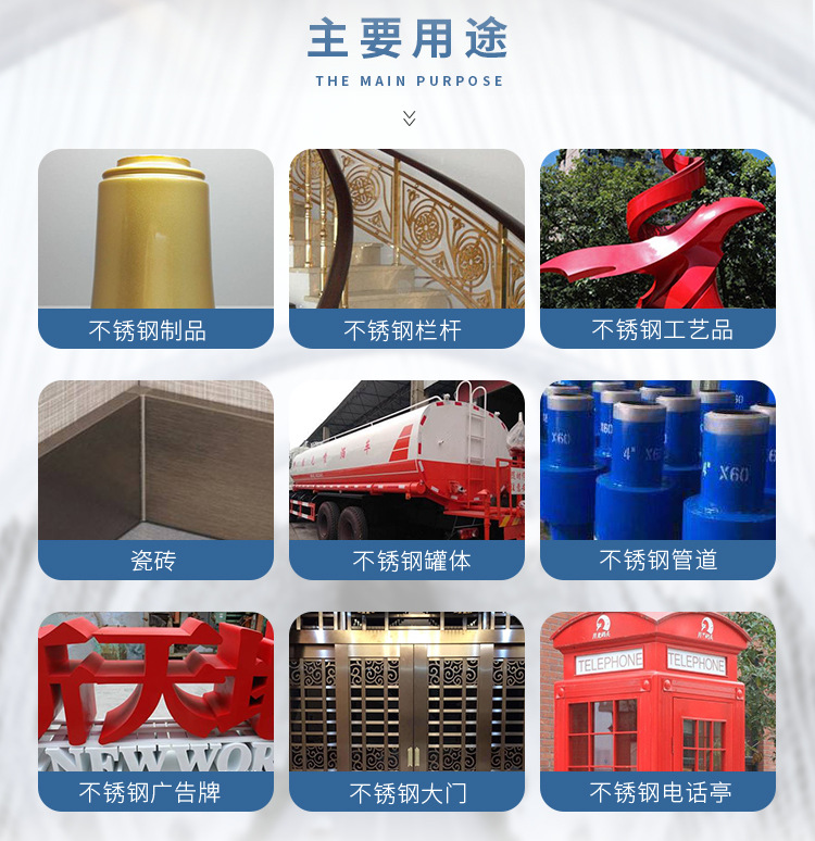 廣泛應(yīng)用于各種不銹鋼制品,不銹鋼板材,不銹鋼設(shè)備,不銹鋼工藝品、瓷磚、鋁合金產(chǎn)品,鋁合金板材,鋁合金門窗等,及其它表面光滑及要求高檔裝飾的物件等,特別適合于戶外使用。
