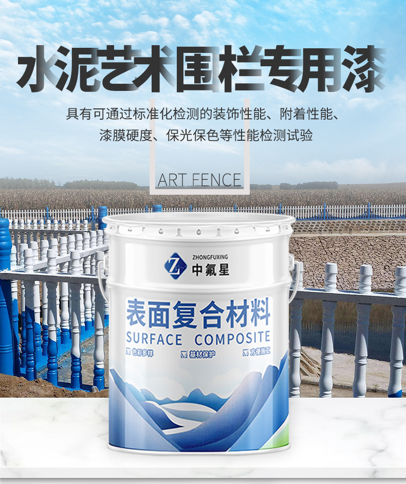 【中氟星】水泥圍欄專用漆是一種裝飾效果酷似瓷釉飾面的建筑涂料,具有可通過標準化檢測的耐水性、耐堿性、耐磨性、耐老化性、附著性能。直接噴涂于環(huán)保圍欄、水泥護欄,藝術(shù)欄桿等表面上,形成色彩艷麗、成膜豐滿的保護層,能夠起到具有標準化防止酸雨侵蝕及紫外線的作用。