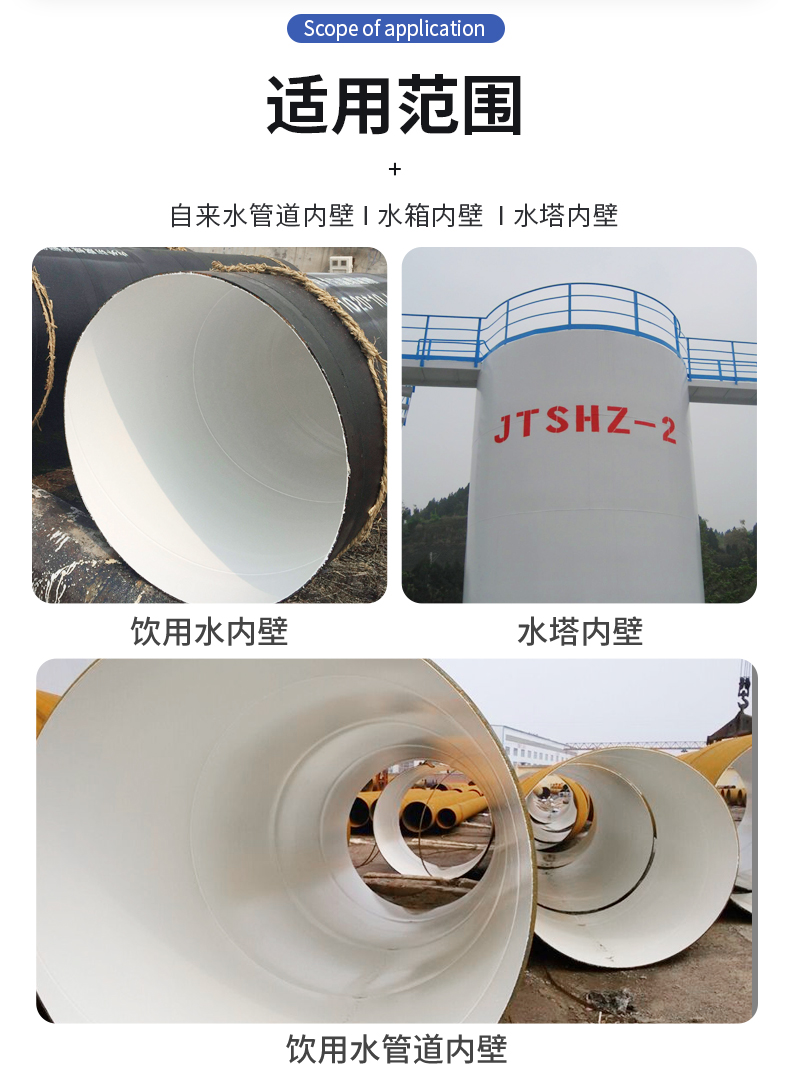 適用于各種盛裝飲用水及啤酒的金屬、混凝土容器內(nèi)壁,飲用水管道、輸水管道、飲水容器、淡水艙等內(nèi)壁防腐防銹使用。
