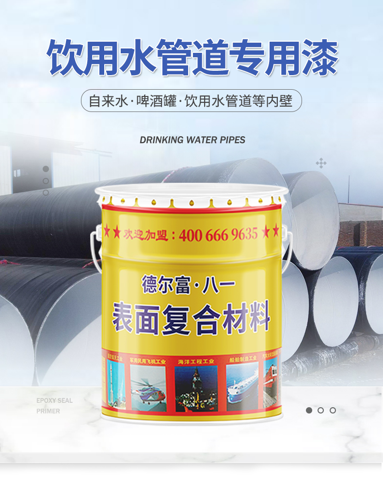 【德爾富】飲用水管道專用漆是由環(huán)氧樹脂、顏料、助劑、無機溶劑等配置為成份甲,改性胺類配制的固化劑為成份乙。