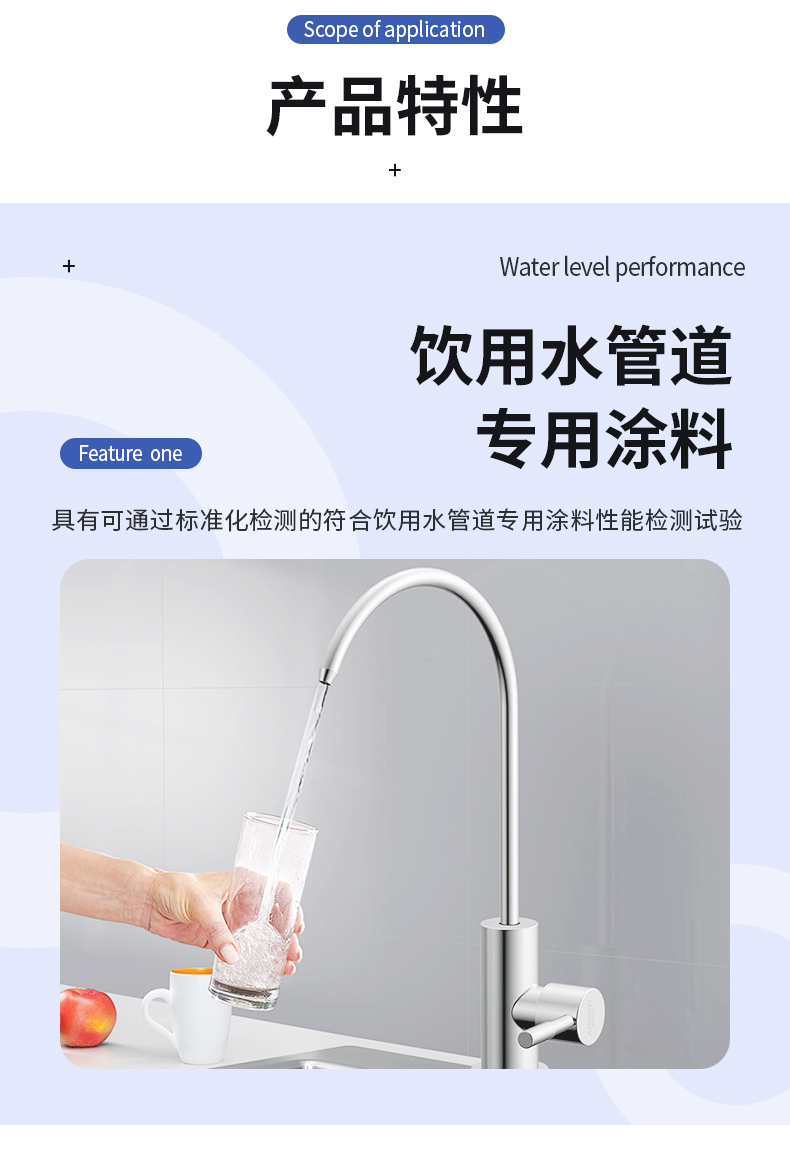 該涂料具有出色的物理機械性能和化學穩(wěn)定性,與金屬、混凝土、陶瓷等材料結合力好,具有標準化的耐水、耐油、耐老化性能,漆膜對飲用水不污染,飲用安全可靠。