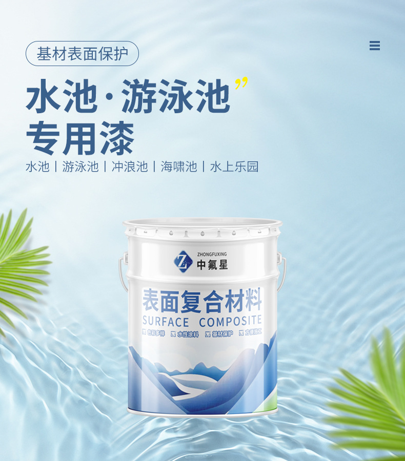 【中氟星】游泳池專(zhuān)用漆是一種專(zhuān)為水池、游泳池等長(zhǎng)時(shí)間蓄水場(chǎng)景所研制的對(duì)環(huán)境友好型涂料,主要用于混泥土制及鐵制的游泳池,蓄水池(非飲用水)的涂裝,具有可通過(guò)標(biāo)準(zhǔn)化檢測(cè)的防滲水、防腐蝕、風(fēng)化、耐水浸泡、耐干濕交替、防止藻類(lèi)生長(zhǎng)等性能。