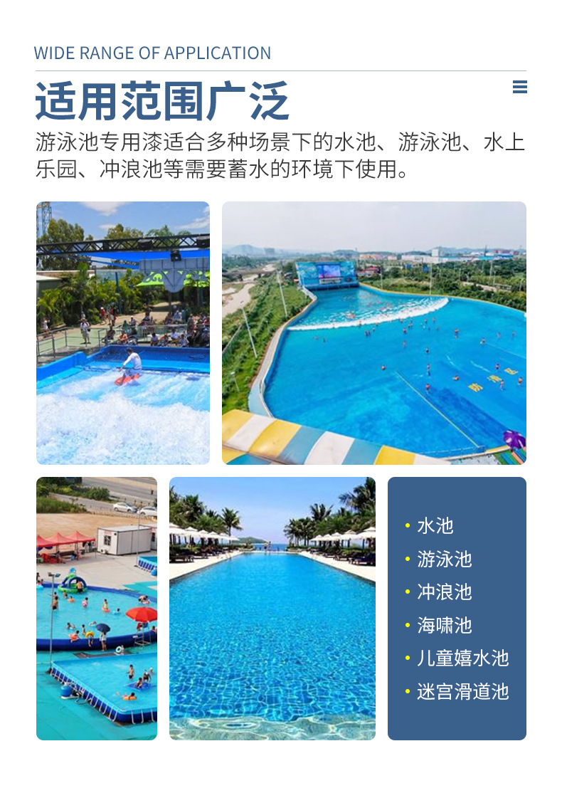 水池、游泳池、沖浪池、水上樂(lè)園等需要蓄水的環(huán)境使用